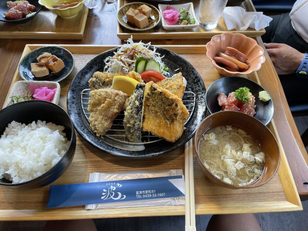 昼食は、惣四朗(https://tabelog.com/chiba/A1206/A120603/12011743/)と夕凪(https://bosotown.com/archives/59428)さんの2店舗に分かれて入りました。鋸南町では順番待ちの店舗で新鮮地魚や野菜を使った少人数型のお店が多いため、数人単位に分かれて、利用させていただきました。